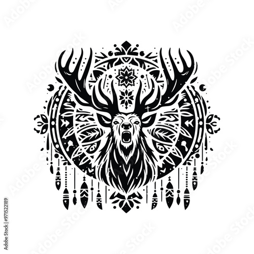 Reindeer in bohemian black and white silhouette illustration