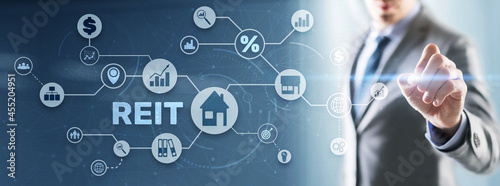 REIT. Real estate investment trust. Financial Market. Hand pressing button on screen