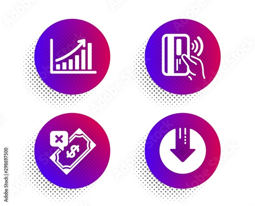Rejected payment, Contactless payment and Graph chart icons simple set. Halftone dots button. Download arrow sign. Bank transfer, Bank money, Growth report. Crisis. Finance set. Vector