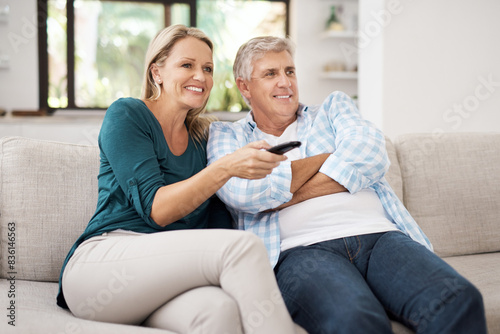 Relax, couple and smile with tv remote on sofa for comedy, online movie and streaming service. Mature man, woman and happy with television at home for film, entertainment and broadcast of media
