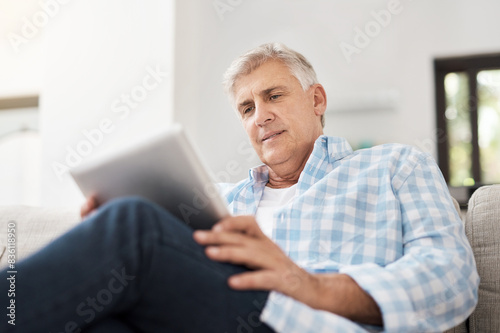 Relax, tablet and mature man on sofa for communication, networking or reading news article in living room. Online, technology and person for watching video, browsing internet or social media in home