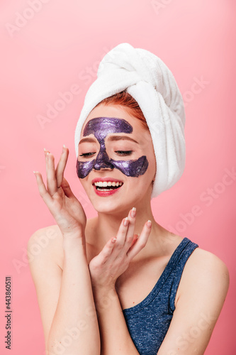 Relaxed european girl doing skincare treatment. Studio shot of positive woman with face mask isolated on pink background.