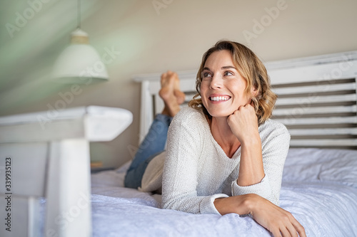 thinking, pensive, woman, happy, home, smiling, contemplation, future, daydream, daydreaming, vision, thinks, comfortable, thoughtful, imagination, imagine, dream, healthy, lying, bed, positive, relax, resting, smile, people, girl, mid, young, lifestyle, leisure, joy, beautiful, carefree, german, caucasian, hand, chin