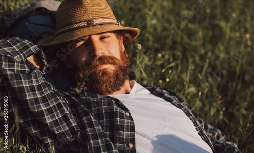 holiday maker, nature, rest, chew, straw, grass, man, lying, travel, vacation, summer, holiday, male, lifestyle, relax, casual attire, hat, bearded, calm, tranquil, serene, peaceful, harmony, idylli, trip, journey, wanderlust, explorer, hiking, trekking, weekend, field, meadow, lawn, countryside, blurred, horizontal, outdoors, copy space