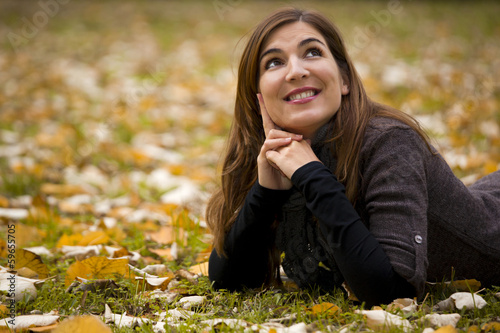 woman, lying, ground, leaf, autumn, fall, smile, happy, girl, smiling, young, park, beauty, woman, people, thinking, thinks, casual attire, natural, enjoy, nature, season, beautiful, colours, expressive, expression, yellow, brown, foliage, garden, landscape, oak, recreation, scene, tranquil, october, 20s, pretty, caucasian