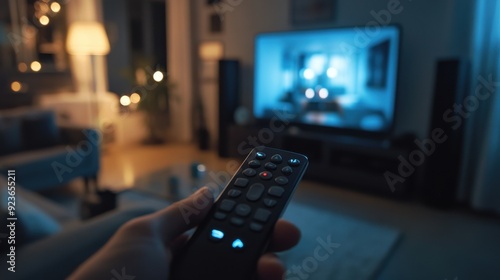 Relaxing at Home: Hand Holding Remote Control Pausing Movie on Smart TV in Cozy Living Room