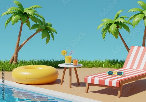 pool, relaxing, summer, palm tree, drink, easy-chair, sunglasses, vacation, refreshment, relaxation, tropical, leisure, summer, beach, coastal, recreation, holiday, lifestyle, sunny, get-away, coastline, table, juice, straw, grass, clear sky, daytime, trip, resting, swimming, rendering
