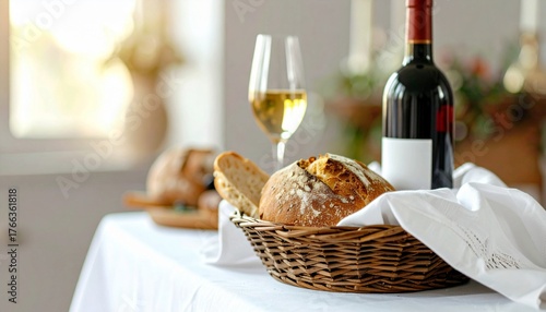 religious, ceremony, wine, bread, basket, wine bottle, glass of wine, christianity, church, christian, concept, religion, faith, prayer, devotion, belief, pray, spiritual, spirit, holy spirit, ritual, service, glasses, white, bottle