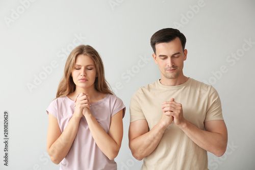Religious couple praying to God on light background