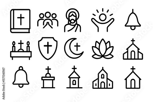 religion, faith, icon, worship, spirituality, symbol, cross, church, people, bible, shield, crescent, lotus, bell, altar, building, temple, christian, mosque, meditation, peace, sacred, belief, community, prayer, tradition, holy, graphic, outline, minimal
