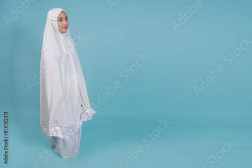 culture, gown, prayer, muslim, islam, islamic, religion, veil, female, woman, young, isolated, blue, background, white, indonesian, indonesia, southeast, asian, happy, smile, beautiful, gesture, mecca, arabic, excited, expression, lady, pose, attractive, cheerful, wear, advertisement, advertisement, 20s, model, standing, pray, copy, space, palm, mosque, holy, god, faith, belief