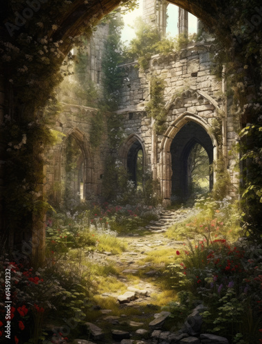 Remains of an abandoned ancient building overgrown with vegetation