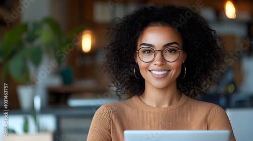 Remote worker participating in a video call on a laptop in a well organized modern home office setup with desk computer and other professional work equipment
