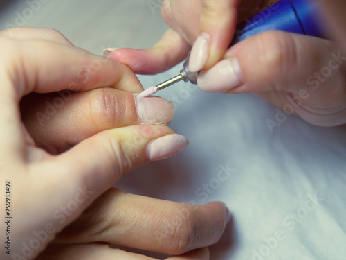 Remove cuticles in the beauty salon. Perfect nails manicure process. Hardware manicure