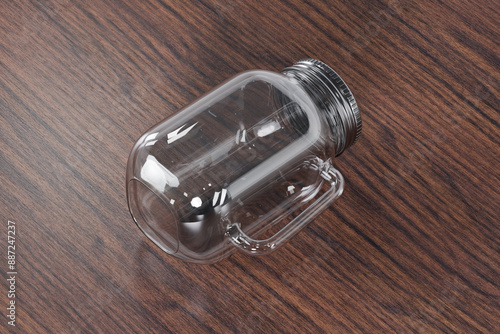 Rendering of transparent glass mug jar with metallic lid and white straw hole placed on wooden background for product label mockup presentation on acute angle