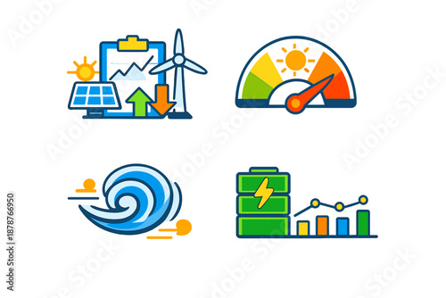 renewable energy, sustainability, efficiency, infographic, icon, solar energy, wind power, battery, power, environment, ecology, green energy, clean energy, climate, environmentally friendly, gauge, meter, chart, graph, progress, datum, analysis, electricity, solar panel, wind turbine, lightning bolt, wave, performance