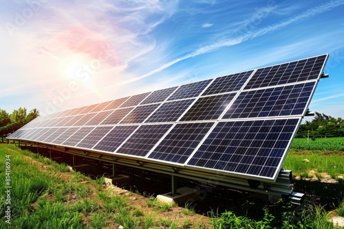 Renewable energy concept with solar panels installed in a green field under a sunny sky