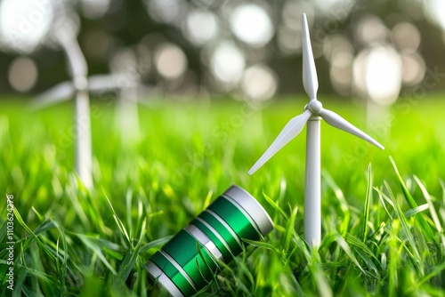 Renewable Energy Concept with Wind Turbines and Green Battery on Fresh Grass Representing Sustainable Power Solutions for a Greener Future