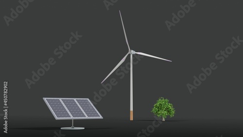 Renewable energy, eco-friendly wind power generation, solar power generation and a tree