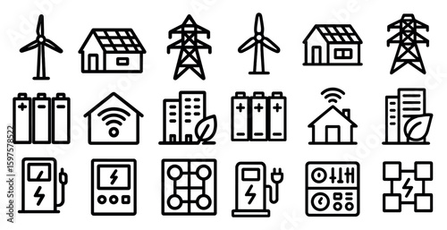 renewable, outline, vector, solar, wind, green, flat, solid, eco, sustainable, environment, electricity, power, clean energy, battery, reusing, grid, biomass, conservation, tech