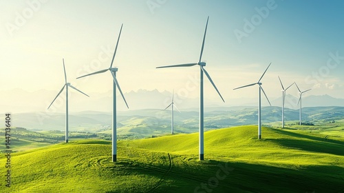 Renewable Energy Source Solar Panel Wind Turbine Concept. Expansive Wind Turbine Landscape Under Bright Sky with Lush Green Hills and Distant Mountains