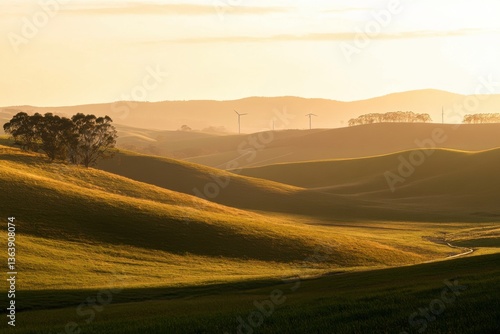 Renewable energy wind farm in landscape with golden hour lighting and negative space above