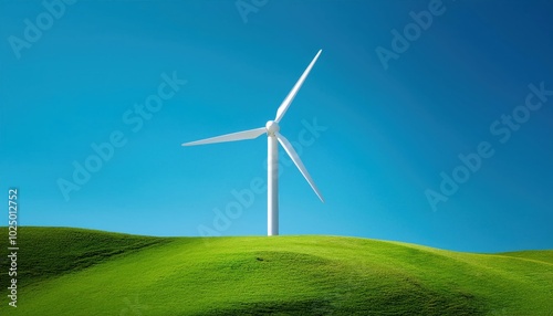 Renewable Energy Wind Turbine on Green Hill with Clear Blue Sky. Clean Energy Concept for Sustainable Power Generation and Eco Friendly Solutions