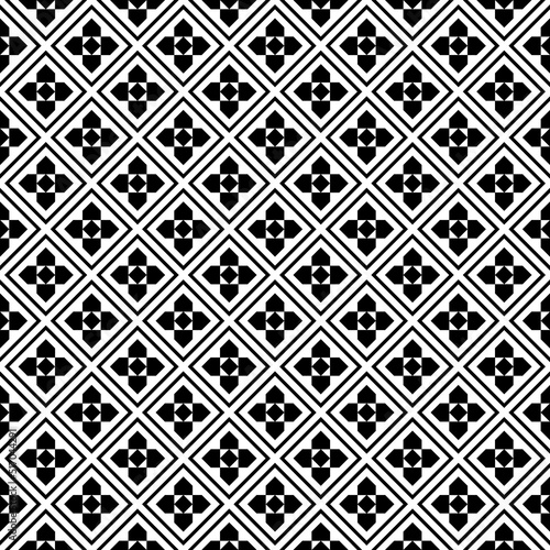 Repeated black figures and rhombuses on white background. Ethnic wallpaper. Seamless surface pattern design with floral ornament. Diamonds motif. Digital paper for textile print, web designing. Vector