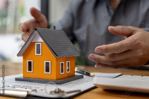Replica of a small orange house sits on a table, a housing project salesperson is drafting a sales contract for a customer who reserves a house in the project he maintains. Real estate trading concept