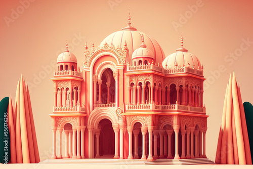 representation of an Indian temple. spirituality of historic buildings' arches. tourist destination Palace. yoga spa icon pastel colors like orange and red Sacred architecture. Individual frame