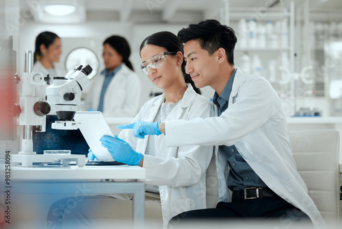 Research team, tablet and science in lab for healthcare, medicine development and innovation. Scientist, people or technology at microscope for analysis, investigation or planning engineering process