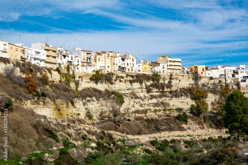 Residential buildings on the edgo of high rock in Sorbas, Spain, Almeria, Andalusia.