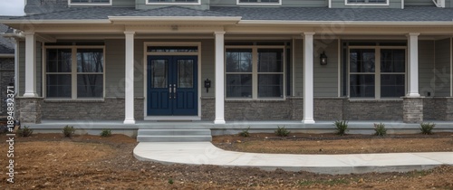 Residential construction finished, featuring dark blue trimmed double front doors, inset windows, a spacious porch with pillars, and an unlandscaped front yard with raw earth