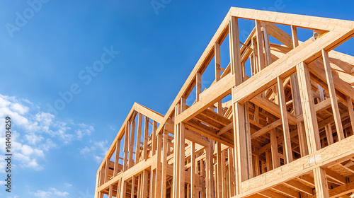 Residential construction site with wood framing under bright blue sky, showcasing progress in building a new home; emphasizing construction techniques.