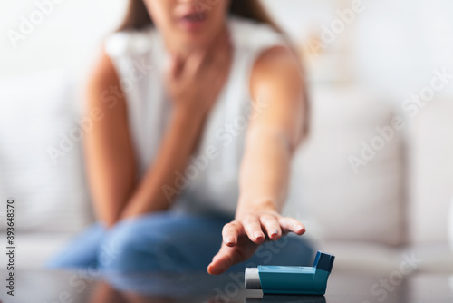 Respiratory Depression. Unrecognizable Woman Reaching For Asthma Inhaler Preventing Attack At Home. Selective Focus, Shallow Depth