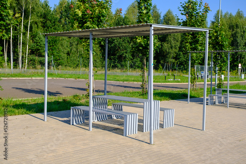 Rest area for motor travelers Poland. A bench with a table with a roof. Expressway stop. Large Parking with light but without cars on the track on a summer.