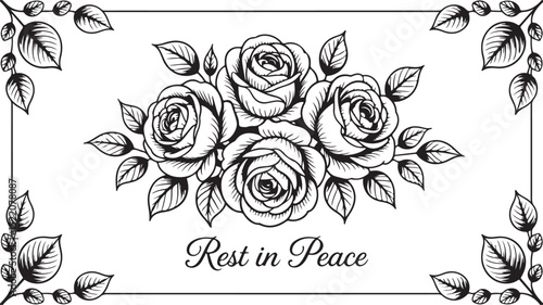 "Rest in Peace Rose Bouquet Illustration – Elegant Black and White Hand-Drawn Roses with Leaves and Frame Design for Sympathy Cards, Memorial Prints, and Funeral Invitations"