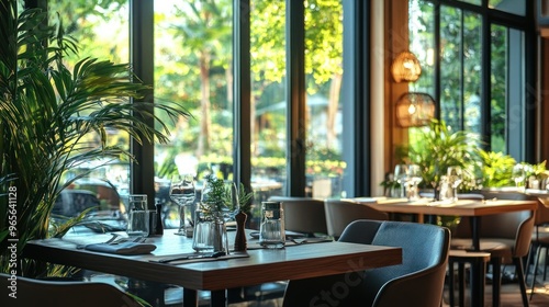 eatery, interior, window, view, table, chair, glasses, tableware, setting, dining, light, natural, green, plant, tropical, modern, minimalist, clean, bright, wood, glassware, napkin, cutlery, furniture, design, decor, style, contemporary, elegant, open, space, ambience, atmosphere, comfortable, inviting, luxurious