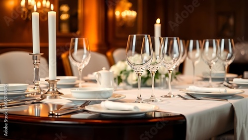 Restaurant table setting prepared for dinner with glasses plates cutlery and napkins arranged for dining or celebration