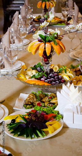Restaurant vintage, cutlery, glasses on the table, bar, bottles, large candles on a white tablecloth, sliced fruit with powdered sugar