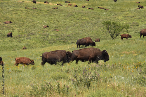 herd, bison, buffalo, animal, wild, wildlife, nature, outdoors, midwest, north dakota, bull, america, summer, environment, habitat, mammal, endangered, outside, male, road, roadway, national park, grazing, graze, roam, landscape