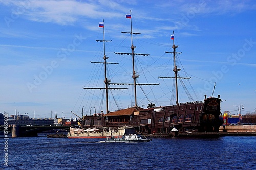 ship, boat, sea, water, harbor, sail, sailboat, nautical, sailing, mast, vessel, port, travel, petersburg, yacht, blue, frigate, ocean, sky, pirate, russia, transportation