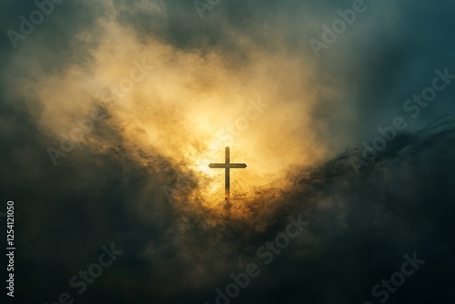 Resurrection scene with cross and golden light breaking through clouds