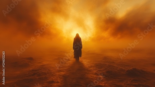 resurrection, silhouette, man, walking, desert, misty, fog, sunrise, sunset, spiritual, hope, rebirth, afterlife, mystery, lonely, figure, sea, sun, water, ocean, beach, sky, landscape, coast, nature, cloud, dusk, horizon, evening, wave, travel, cloud, vacation, island, light, boat, summer, orange