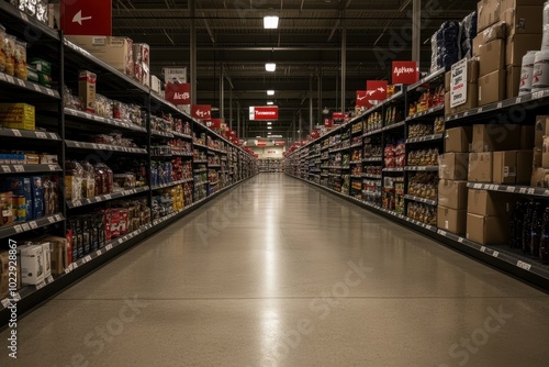 Retail Store Aisle with Sale Signs: A wide shot of a retail store aisle filled with products and sale signs hanging from the ceiling. The image highlights the abundance of deals and the organized chao