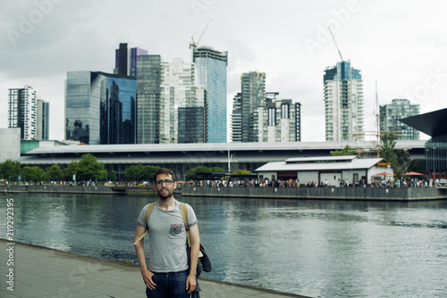 Retrato de hombre joven con gafas frente a paisaje de rascacielos en una gran ciudad sobre un cielo gris y nublado. Arquitectura de edificios altos azules y de cristal.