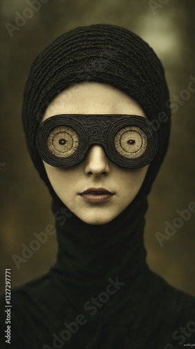 Retrato surrealista de una figura enigmática con un velo negro y gafas grandes y decorativas, en un entorno sombrío.