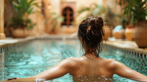 Retreat and vacation Beautiful young woman relaxing in spa private swimming pool in beautiful moroccan backyard : Generative AI