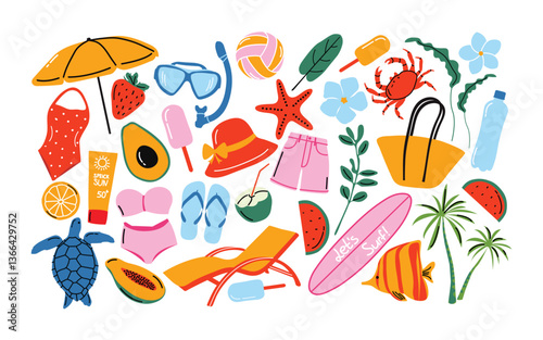 Retro 90s Summer Beach Sticker Pack – Funky Groovy Vacation Vibes. Bright Summer Party, Sun, Swimwear, Shore and Beach Season Elements. Patches, Labels and Stamps Collection.