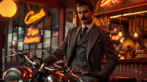Retro Chic: Stylish Man in Tailored Suit with Vintage Motorcycle in Neon-Lit Diner Setting